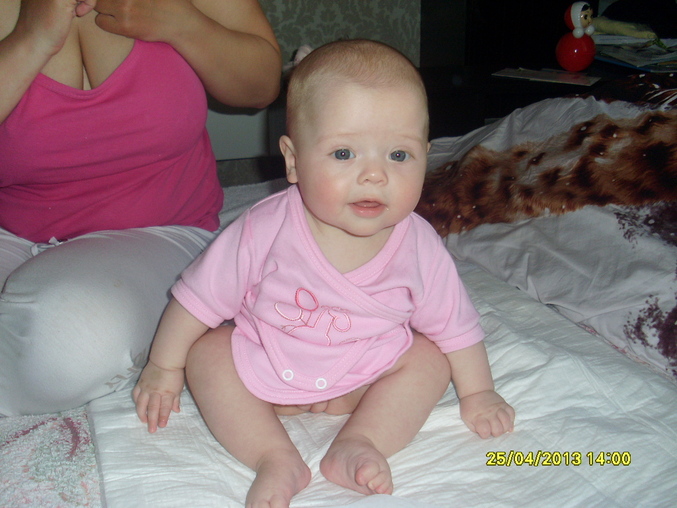 поздравляю!!!а не рановато ли?нам вот в мать и дитя и у ортопеда сказали, что не сажать и что ребенок должен сам сесть из положения лежа. Девочке лучше до 7 месяцев вообще не садится. У тебя Анфиса такой же лысик как моя Карина!!!Я уже на теплую погоду купила повязки!!!