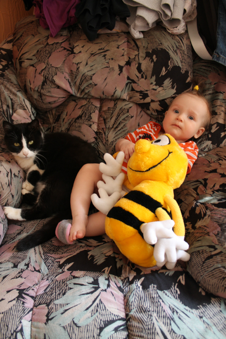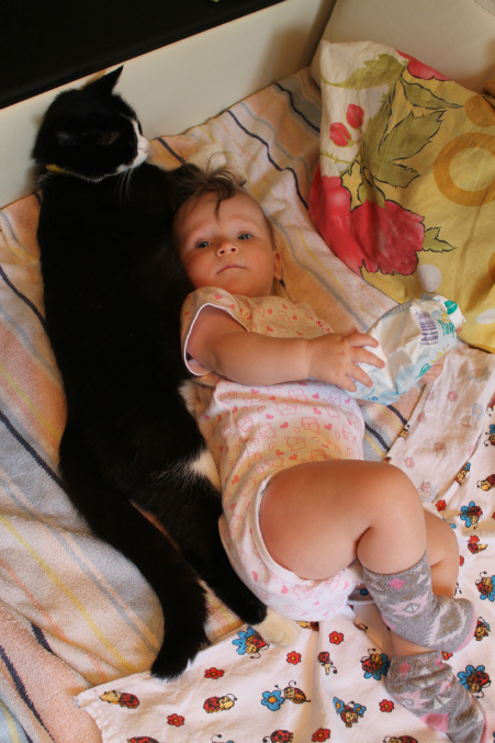 Я до 6 месяцев кошку к Софе вообще не подпускала, а тут они знакомились поближе