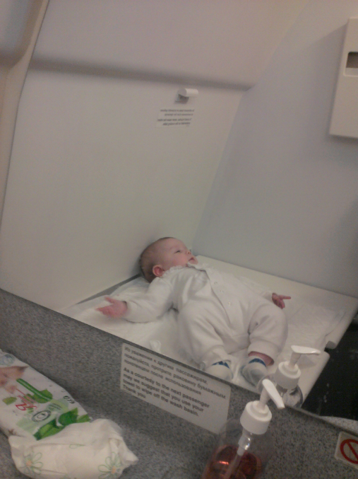 полет был в час дня. к тому времени как мы прошли зону досмотра, моя ляля уснула и проспала до окончания взлета, потом нам также принесли люльку и мы продолжали в ней спать.как проснулись, поели, потом у нас возникла остая необходимость переодеть памперс и мы пошли в сторону туалета, пока шли, всему самолету улыбались как впрочем и сидящие пассажиры нам. приятно. в туалете хоти и тесно, но условия для лялек существуют