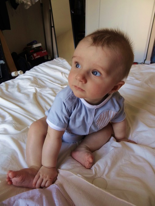 Итак, переворачиваться как положено, мы не хотим, зато любим сидеть. Цепляется за мои пальцы, за собственные штанины, за всё, что угодно, и пытается подтягиваться. Если чуть-чуть помочь (хотя б страховать), то усаживается и ликует. Правда, недолго ликует - он как старуха из Золотой Рыбки. Лежит - надо сесть. Сел - хочет встать. Встал - надо шагать. Я противник ранних присаживаний, "пристаиваний" и прочего, но приходится все же, стараюсь не часто. Он слишком настаивает. Я иногда соглашаюсь только на "посидеть", а он выпрямляет и напрягает ноги и таким образом воздымается. И сразу огромная улыбка на лице, даже если орал по какому-то поводу до этого, то стоит ему встать, тут же восторг!