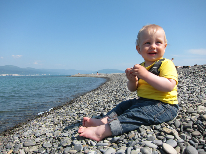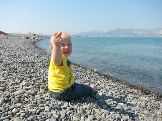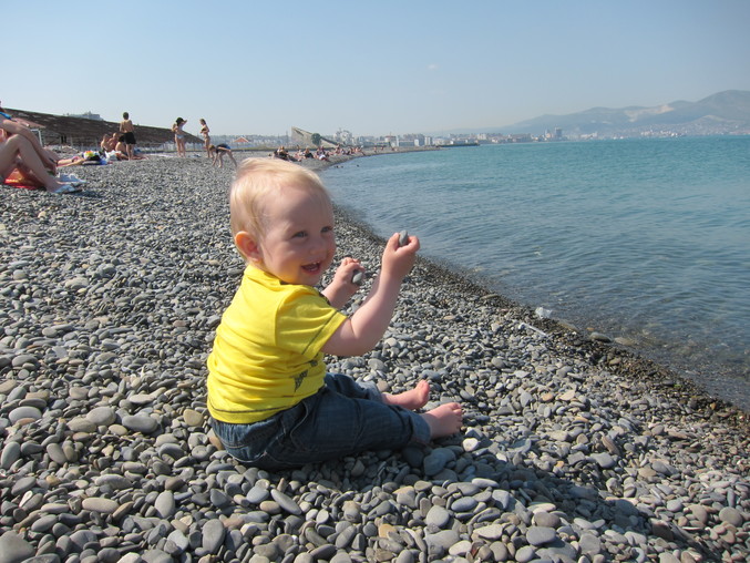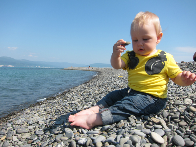 На прогулкеДобрели мы сегодня до моря. Леву посадили на теплые камушки. Сначала он их несмело начал трогать, потом перебирать, а потом кидать в море как взрослик))) Долго сидел, визжал от восторга первое время. Потом подуспокоился, в коляску начал запихивать))) все в дом, в хозяйстве пригодится)))
