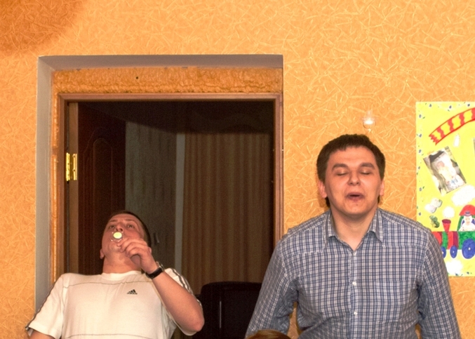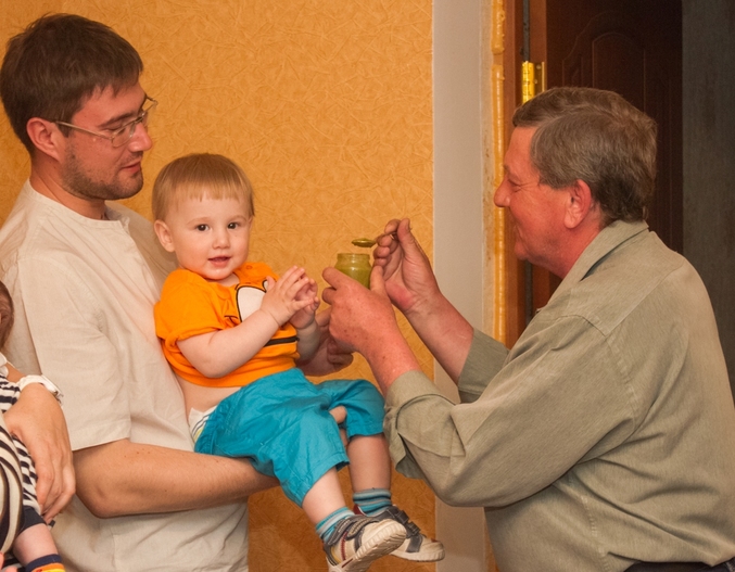 Далее провели "гадание": Петруше на подносе предложили выбрать один из предметов (кисть малярная, монета, ключи, чеснок, книга). Он недолго думая, выбрал кисть (способность к искусству) , отправил ее сразу в рот, вернулся и ухватил весь поднос! Все одеваются, вручают мне именинника и уходят на работу, а папа на огород. )))
