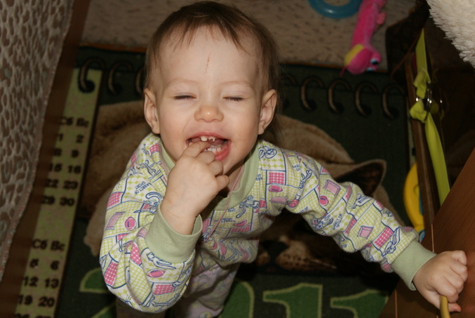 в один прекрасный солнечный день, мы по обыкновению своему встали-умылись-зарядочка/массажик-покушали и пошли себе на пол играть. Дочка ползает везде, изучает, встает. Я рядышком, белье сняла с сушки, фасую и за козявишной поглядываю, время от времени страхуя. Тут она подползла к журнальному столику, встала, хорошо стоит, уверенно, одной рукой держится, другой - стол щупает. Я подошла, рядышком стою для подстраховки. Вот, ей-богу, даже не поняла, что и как произошло. Чуть качнулась, не упала (а я сзади стояла). И как заплачет (как никогда). Я ее хватаю, она ревет. В рот глянула, а у нее кровушка там и зубик смещен. Я чуть в обморок не упала. Схватила ее, на кухню, лед достала прикладываю. Одновременно, набираю знакомого на машине (благо недалеко оказался), прошу в стоматологию отвезти. Пока дочку собрала, выскакиваю, в машину прыг и бегом в хирургу детскому. К тому времени, лед сработал, Алинка успокоилась. Но лицезрение смещенного зуба у меня вызывал тихий ужас, шок. Все эти действия предпринимала неосознанно, спонтанно, как в тумане. Руки тряслись. Прибегаем в стоматологию. Там пересменка у врачей. Я в кабинет, объясняю так-мол и так. Тети-врачи на нас посмотрели, пожалели и приняли. Я на кресло, Алинка на меня, а над нами целый консилиум. В итоге: зуб вправили, он не треснул, не раскололся и не вылетел. Ушиб такой. Теперь в течение 3х недель ничего грызть-кусать нельзя. Вот такая вот история.