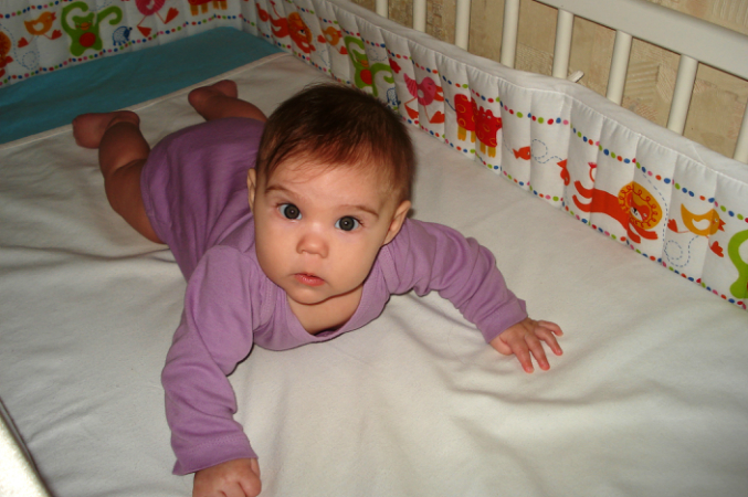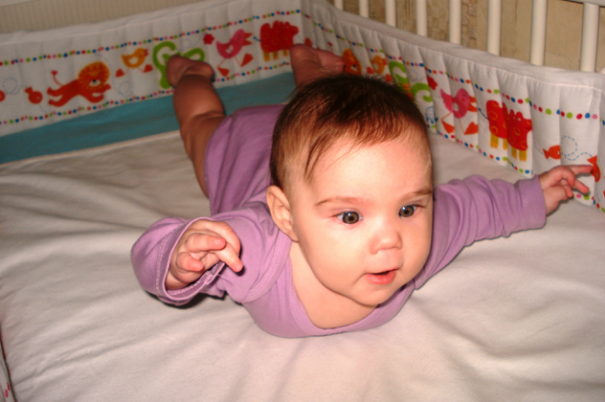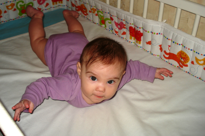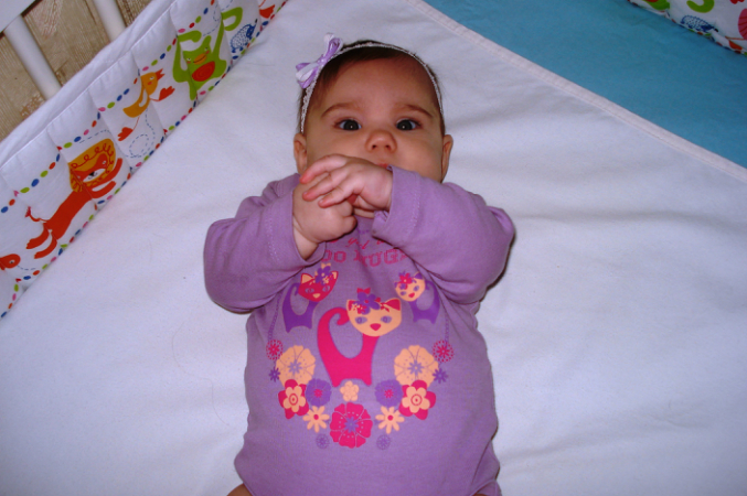 Пытается сесть и на спине приподнимается на локтях и злится, когда мы ей не даем)) Рановато еще! Спит всю ночь прекрасно, в 9 веч. купаемся обычно при t=31 градус, затем упаковка и кормление, обычно в 10 веч. отбой, засыпает с сисей, потом перекладываем в кроватку... Просыпается потом лишь в 3-4 утра, затем в 6-7. А молока у меня меньше не становится, грудь к утру прям затвердевшая, приходится одной кормить, другую сцеживать...