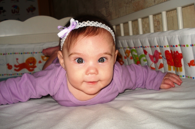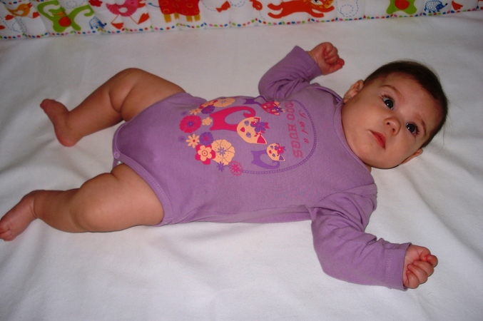 Сейчас по-прежнему жаждет общения, не на руках - а просто чтоб поговорили, поиграли, одна валяться не любит, и обожает, когда ей поют и рассказывают потешки)) Восклицает от радости! На полном ГВ по-прежнему, до 6 мес. точно будем так. Молока много, очень много - думаю найти Евуне молочного брата или сестру... Пол-морозильника забито моим замороженным молоком, а Евуня ест хотя и часто, но понемногу... Грудь все время переполнена, а пить меньше не могу. Переживаю, чтоб не переедала, и так мне кажется, что уже удвоили свой вес от рождения, явно уже за 7 кг зашкалило... В конце мая пойдем делать 2ю Пентаксим.