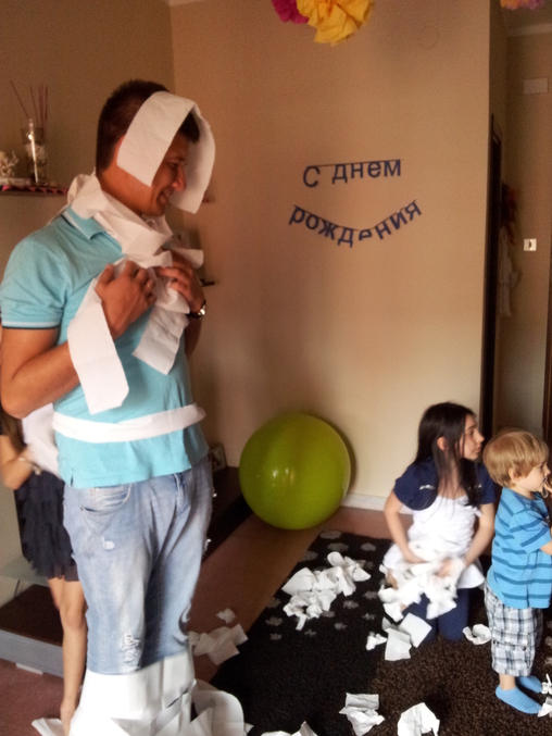 1. туалетная бумага-это просто фурор! Делаем мумию! Смеху и радости, что в процессе, что после, когда бросались бумагой изображая снег.