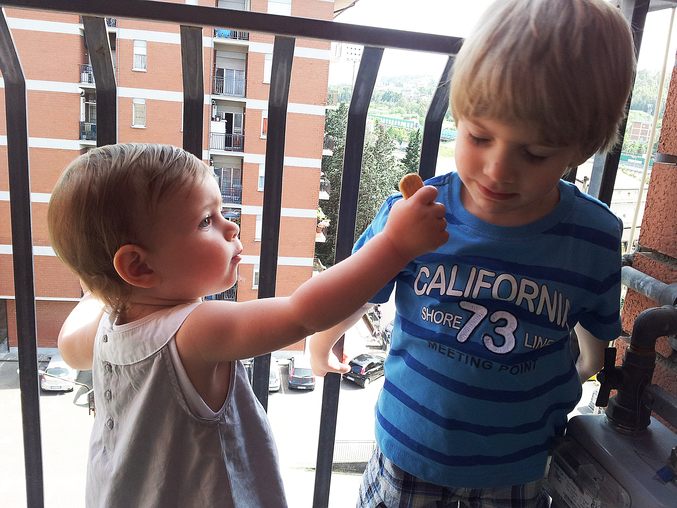 Ева делится своими печеньками с единственным мальчиком