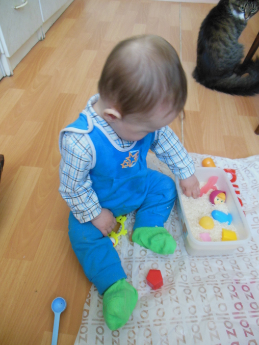 Затем мы начали тренировать моторику крупами и разными мелочами в коробочках