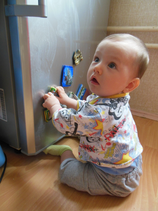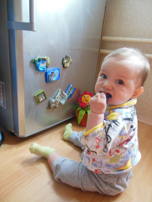 Потом мы придумали играть с магнитиками на холодильнике - увлекает надолго! Можно успеть много дел, пока малыш увлеченно тянется к ним, отрывает, пробует на зуб и пытается назад прилепить, но в итоге кидает куда подальше и смотрит, как они летят) Потом дело - за следующим магнитом) Главное - вовремя подсовывать на холодильник новые)