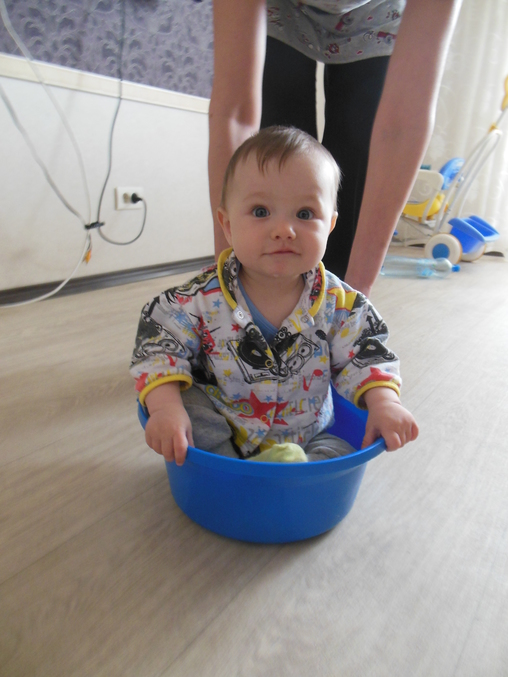 Потом обнаружилось, что невреоятно интересно выкладывать из обычного тазика различные вещицы (даже не обязательно игрушки) фото правда нет, но зато есть фото в пустом тазике (после того как из него уже все вытащили))) Решили сесть в него и покататься)))