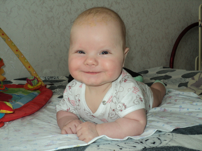 ХвастаемсяУра! Еще одна маленькая дата! Мы растем и растем...весим почти 8 кг, рост 68 см. Даа....покушать мы очень любим )))) Умеем подолгу лежать на животе, хватаем игрушки, много болтаем, смеемся. Очень хотим сесть (голову и плечи подтягивает вовсю, тянет себя за ползуны и кряхтит) , но я не разрешаю, рановато пока...