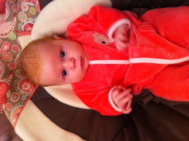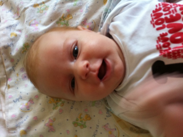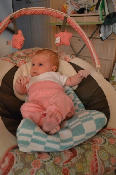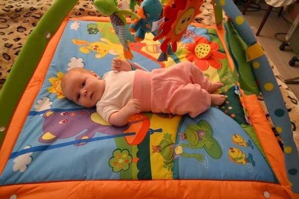 Потихоньку входим в режим. Мы на ИВ. Кушаем каждые 3,5-4 часа и съедаем по 120-150 гр за раз. Спит с нами, все никак не могу начать отучать. Да и не знаю как... На ночь пеленаемся, иначе без пеленок долго не спим. А днем нет. Спит хорошо, просыпается только покушать и дальше спать. Ложимся около 12, просыпаемся окончательно около 11-12 часов. Так что высыпаемся) Животик не беспокоит, пукаем, какаем 1 раз в сутки. Купаемся хорошо, нравится! 2-3 раза в неделю с кругом (сейчас хоть начала двигаться, ножками дрыгать, а то раньше сидела в воде, не шелохнувшись), а так каждый день под душем полоскаемся, ей очень нравится! Ну а вообше больше без круга любит купаться, просто в ванной ее подмышками держу и она плавает. А так она у нас не особо активная, ножками и ручками дрыгает, когда очень веселая, когда радуется) А еще мы очень ручные, проснется, покушает, 30-40 минут поиграет, пообщается, поулыбается, дальше ей надоедает и требует, чтобы ее на ручки взяли, столбиком и обязательно по квартире надо ходить и разговаривать)) Тишину не любит. Обожает, когда работает пылесос или фен, лежит молча, думает о чем то в это время) На животике лежать любит только у мамы на животике, мы с ней как черепашки) ляжет, и начинает кулак наяривать, головку поднимать, гулить, слюни пускать) И ползет, если я ей ладошки подставляю! А так как просто на поверхности лежать на животе не любит, я и не могу знать смодет ли она с животика на спинку перевернуться, смотрю, у многих тут уже переворачиваются. А так из умелок может со спины на бочок лечь и обратно, любит кулачки свои, игрушки любит, особенно слоника) потихоньку уже щупает его за хобот, трогает ручками, не знаю, осознанно или нет. Мобиль ей уже менее интересен, поднадоел, а раньше могла минут на 15-20 на нем отвлечься. Любит развивающий коврик, на электрокачелях может минут 5 посидеть. Улыбается во все десны) Узнает своих и реагирует на чужих, если кто то незнакомы ей человек возьмет на руки, сразу губки так буквой "С" состроит и плакать начинает, в такой момент хочется ее прижать к себе и не отпускать) Гуляем в среднем по 2-3 часа в день, бывает один раз все это время, а бывает разбиваем на 2 раза. Теперь в коляске спис меньше, больше глазеем на окружение, игрушку, а когда надоедает начинаем капризничать, но если на нее не обращать внимани, то минут через 10-15 засыпает. Коляску Обязательно надо везти, если стоим, то ерзает недовольно. В общем, девочка у нас с характером! Строит родителей как хочет) ну вот, в принципе наверное все! И фото, фото с телефона, извиняюсь за качество. Под кат не убрать, так как с телефона.