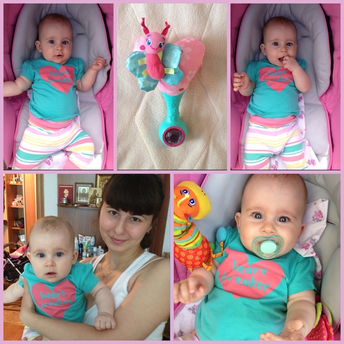 Физическое развитиеПоследние два дня для меня были очень тяжелыми, после прививки АКДС доченька не температурила, но постоянно плакала, капризничала, играть ни хотела, на ручках сидеть ни желала, укачивала по полтора часа на руках, вообщем ничего не радовало мое солнышко и еще эти десенки, хоть и мажу Калгелем, но все равно кулаки постоянно во рту. Очень тяжело, знать что твоему любимчику плохо, а ты ничего не можешь сделать, лучше бы у меня болело( До сих пор у нас уплотнение на месте прививки, красное пятно прошло, осталась царапинка от укола. А сегодня Полиныч спала до половины одиннадцатого, мама даже успела перегладить гору белья - Урааа! Вообщем Полик встала веселая, игривая, и весь день такая пусечка, у меня сердце радуется! Сходили погуляли с папочкой и его сестренкой, и купили доченьке интересную игрушку, если ее трясти, она прикольно поет. Кстати игрушку доча сама выбрала, я ей показывала игрушки, а ручки потянула она только к этому сердечку) А еще, мы уже как неделю пересели в прогулочную коляску Capella, как же я скучаю по нашей люлечке Peg perego, но это уже совсем другой пост....