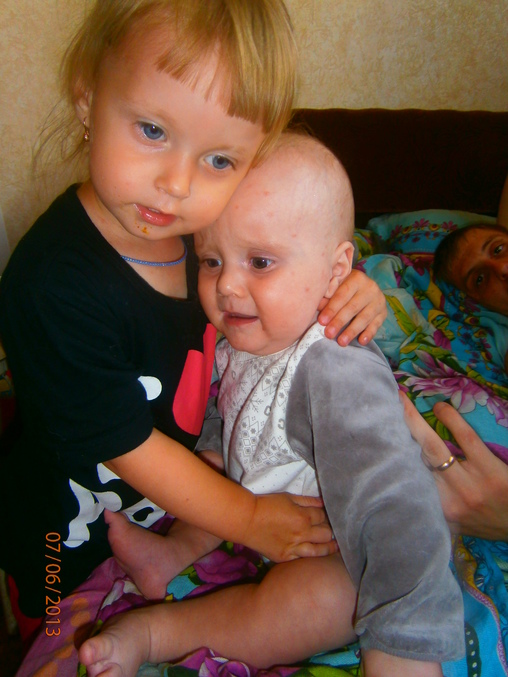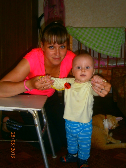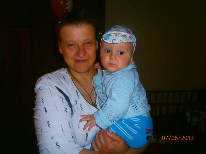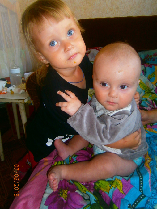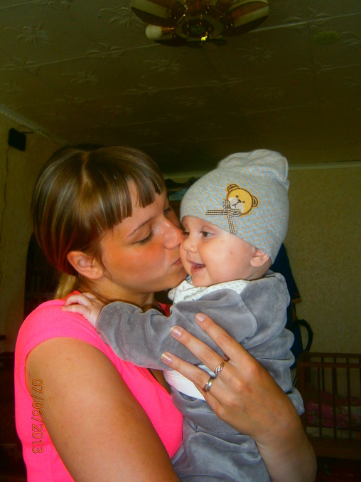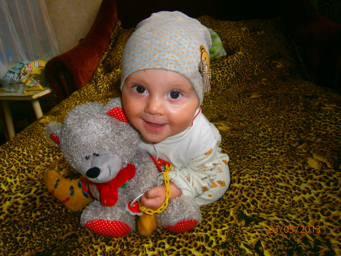 А теперь о Ванюшке. Ванюшка у нас по натуре лентяй,маленький пухленький.Он очень не любят когда его заставляют что то делать,например он не любит лежать на животе,плачет только так...Естественно как и все детишки любит сидеть у мамы на ручках.Вот по этому Ванюшка немного у нас отстает от сверстников,на данный момент мы не сидим,не пытаемся даже,не ползаем и не переворачиваемся до сих пор.Вчера были у невропатолога,назначил курс лечения и массажа,очень надеюсь что все пойдет на пользу,потому что от домашнего массажа через 15 минут он начинает горько плакать поджимать губки и трястись!Еще сказали не кормить его по ночам больше,вот на этот счет я не согласна,он же кушать хочет,чего ж ребенка голодом морить!Из продуктов мы очень любим мясо и творожок!!!Прям причмокивает когда кушает и это так мило)))На говядину у нас аллергия,даже один раз сама ему мясо прокручивала,а вот кролик с цветной капустой идут у нас на ура.Аллергия у нас затихает по тихоньку,если раньше мы мазались 3 раза на дню,теперь раз в неделю.Испробывали из каш гречку и рис,пока сидим на гречке дома ее целый запас,гречку мешаю с творогом и каша улетает моментально и старшая тоже эту кашу ест хотя ее тяжело вообще заставить что то съесть.Сегодня были на приеме,теперь мы 8100 грамм(+300г) и 71см(+4см) ,за погода мы выросли на19!!!!! см и прибавили 4850!!!!грамм,врач была другая поругала нас за наш вес,сказала что он ленивый хомячок и глупо ждать от него что он сядет!