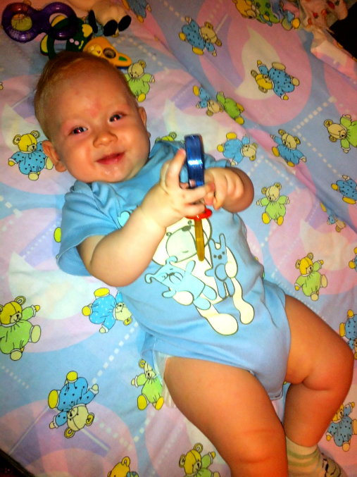 Вот сынишке и пол-годика! так гордо звучит)))) уже совсем большой стал......смышленее и проворнее ))) да и мне стало гораздо "веселее",теперь не присесть.....))) и тренажеров не нужно))) требуется мое внимание и скорость...то прыгнет,то дернет,то отскубет,то возьмет то,что нельзя......особенно нас привлекают все веревочки,шнурочки и провода