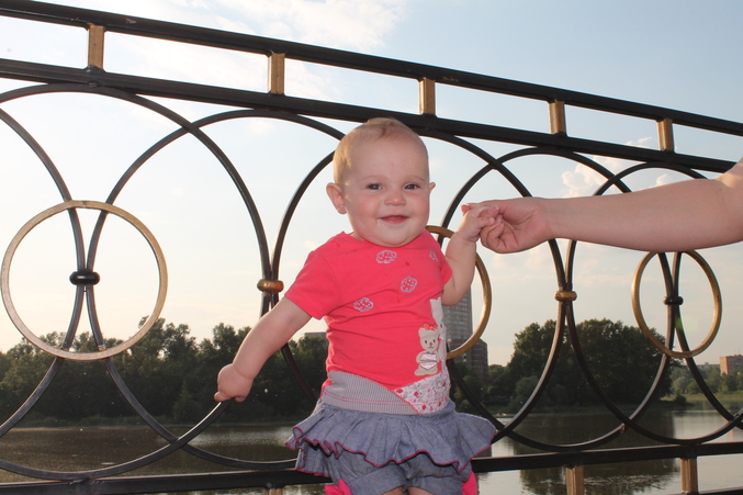 Вылез зубик,второй на подходе вот вот.Активно ползает,ходунки не нравятся,плачет.Делает ладушки(хлопает в ладошки),показывает какая Варюша стала большая(поднимает ручки вверх)редко правда и по настроению.Вчера вечером добралась до ящиков шкафа,пока только открывает и закрывае дверца,скоро пойду вещи вход.Пытается вставать держась за кроватку