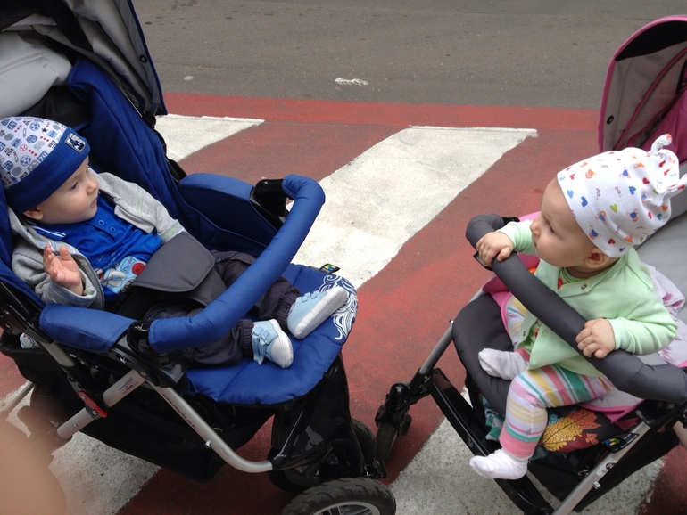 А это наш друг Даня. Малыши любят трогать друг другу ручки. Кода Данечка видит Поленьку, становится таким деловым и серьезным, а эта лиса, как заприметит его, чуть ли не подпрыгивает в коляске от радости)