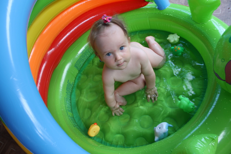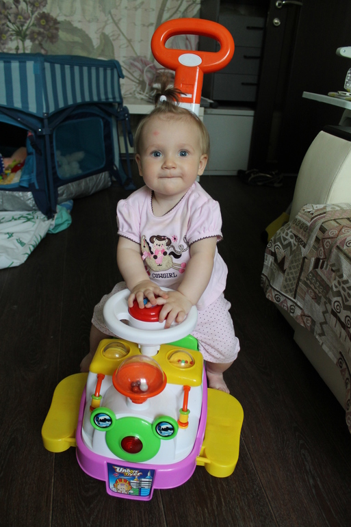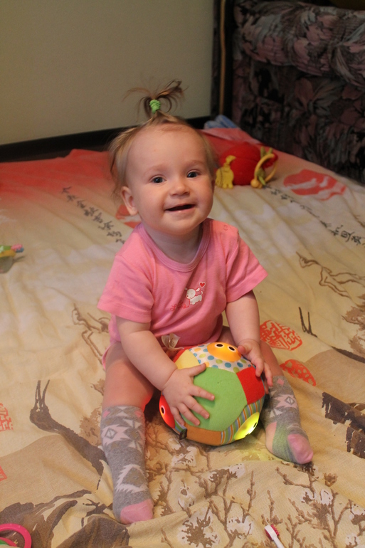Что же мы умеем: "фонарики" и "ладушки" давно умеем, научились махать "привет-пока", когда смотрит мультик тинни лав, то даже какие-то звуки похожие на привет произносит. маму зовем "мааам", но только когда капризиничаем, а вот папу зовем в хорошем настроении, еще ба-ба, отдай, дай и т.д. научились оттопыривать указательный пальчик для нажатия кнопочек на чем либо. София стала больше смеяться. Теперь у нас 4 зуба, сверху и снизу по 2, и это все за месяц! Педиатр сказала, что вот-вот еще вылезут и сверху и снизу одновременно, так что мы резко стали зубастиками. Меня не кусает, только грудь стала сосать как-то с остервенением иногда не очень приятно. Еще за этот месяц мы научились очень быстро ползать, садиться и сидеть очень долго, а ведь месяц назад мы этого не умели! Встает у опоры где-то 1-2 раза в день, но это для нас хорошо, т.к. у нас была дисплазия. Мы не торопимся.