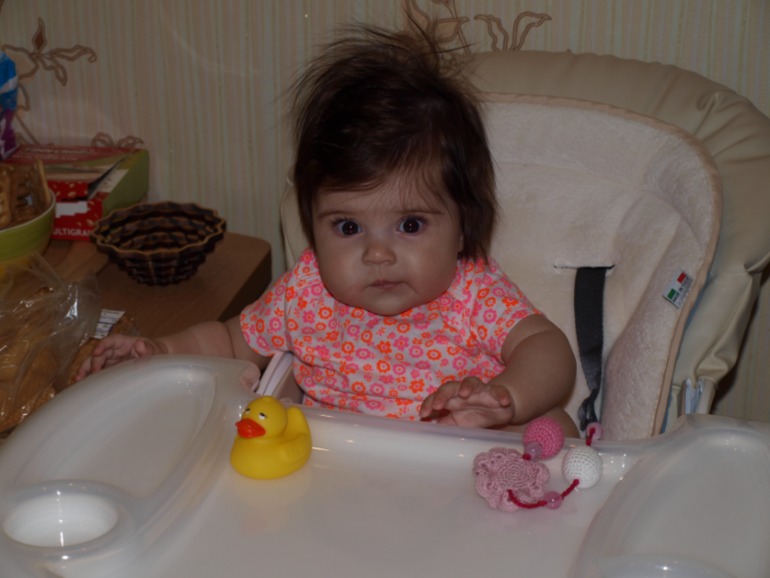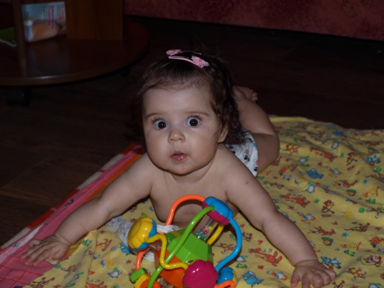 Ходили к врачу: вес 6900, рост 67, набрали всего 300 гр., педиатр сказала ничего криминального нет, к полугоду вес удвоили, так что все нормально, но уже можно вводить по-тихоньку каши. Уже попробовали рисовую безмолочную Хайнц, ну дочка восторга не высказала, но и особо не плевалась. Воспринимает еду больше как игру, но в наши тарелки лезет только так. Выхватывает ложку, аж до крика если не даю, так что каша у нас уже и в волосах была, и на глазу, и на стульчике:)) Вообще очень самостоятельная стала и не терпит никакого насилия (в смысле чистки носика, одевания и т.п.):))) А еще хитрющая очень:) Начала лепетать, особенно когда сердится, когда что-то не нравится: прям ня-ня-ня и ай-ай-ай получается. Не ползаем пока ( ну если только немножкона пузе как раненный боец) и не сидим сами, но если ухватится за мои пальцы или еще-что-нибудь подтягивается и садится запросто, а стульчике вообще не уложишь - тут же крик на всю квартиру. Переворачивается легко и на живот, и на спину, любит валяться на полу на животе и подниматься на вытянутые руки. Гуляем уже в прогулочном блоке нашей коляске, так как Кире нужно все видеть, а в люльке не интересно. Спит по 3 раза в день, ночью с 23.00 до 8.00 (с одним кормлением), но сейчас еще зубы лезут так что может и несколько раз проснуться, чтобы к груди приложиться, но быстро засыпает. Очень нравится ей трепать всех за волосы, особенно маму (любит перед сном запустить всю пятерню мне в волосы и так уснуть:) ) Обожает купаться в большой ванне. Купает папа: это у них общий ритуал, я не вмешиваюсь, только полотенце подаю:)) С понедельника начнем курс массажа, думаю что после этого встанет на четвереньки и поползет:) И несколько фото:)