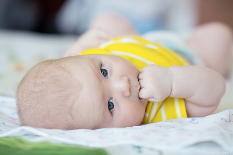 подмышками. К игрушкам активный интерес, трогает, ощупывает, когда сосет