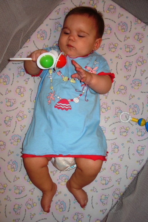 - наконец-то стала играть со своими ножками (но до рта пока тяжеловато дотянуть))