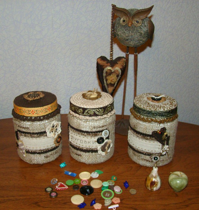 Мы делали как на первом фото...набор майонезное ведёрко так оформляли и вокруг него баночки...В ведро нитки класть и иголки втыкать.в баночки пуговицы и мелочь..Дарили всем родственникам по такому набору..