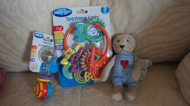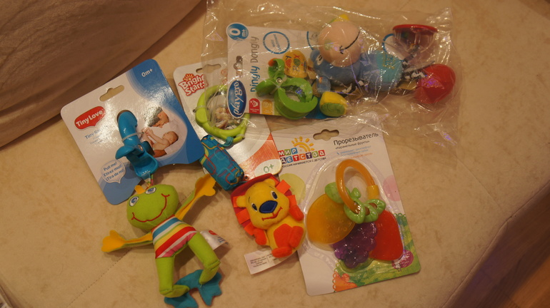 прорезывателель просто очень большой, лежит на пузе, а она его двумя руками держит...покупала все игрушки еще во время беременности в магазинах, по одной-две прихватывала, старалась подбирать все разные по функционалу, одна с колокольчиком, другая вибрирует, третья шуршит, но муж считает,что все эти этигрушки детские сейчас одинаковые)))))Еще кстати кубик развивающий у нас в почете, его купила недавно