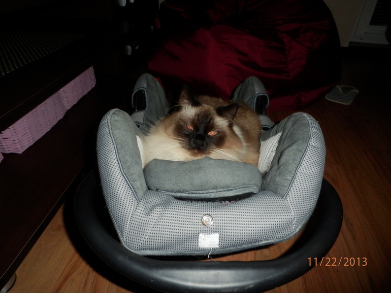 О тески, только на месяц старше))) наш кот в коляске любит обитатьи переноске. Фиг выгонишь, а вот в кровать не лезет. Красивый кис у вас. А что за порода, окрас как у сиама)