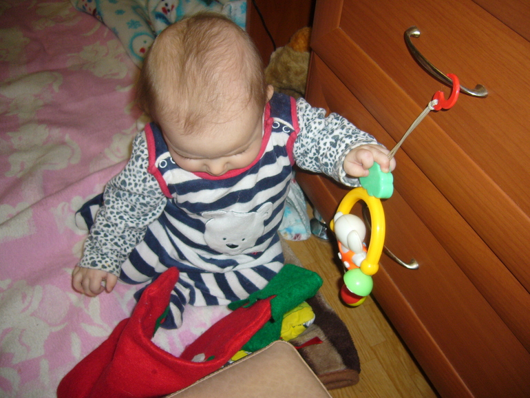Растите здоровенькими!!! Умничка какая, а мы только думаем над этим)))) Делаем специальное упражнение. Что бы поняла сам процесс перехода из горизонтального положения в вертикальное. Смеется))) У нас тоже такая игрушка есть, как у вас за спинкой. Самая любимая!!!