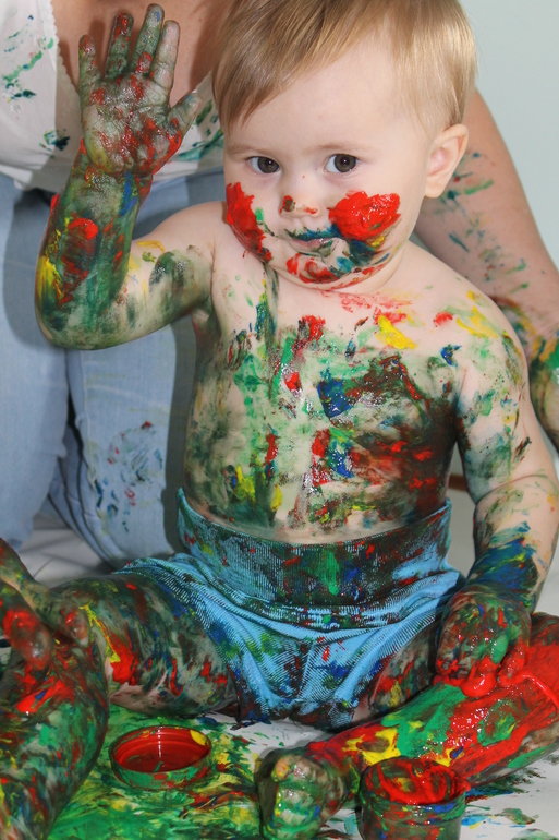 Налила немного краски по блюдцам. Поставила по центру, пустили дочь, она сразу сообразила что к чему. Сначала изучила консистенцию , потом попробовала смешать, нанесла на себя , намазала на клеенку, веселились мы не долго, т.к. моя бусинка решила поделится со мной своей радостью. К слову сказать до этого момента я мыться не собиралась.