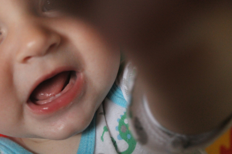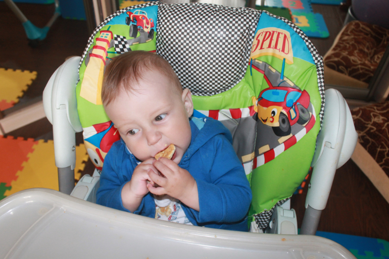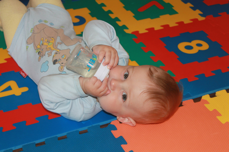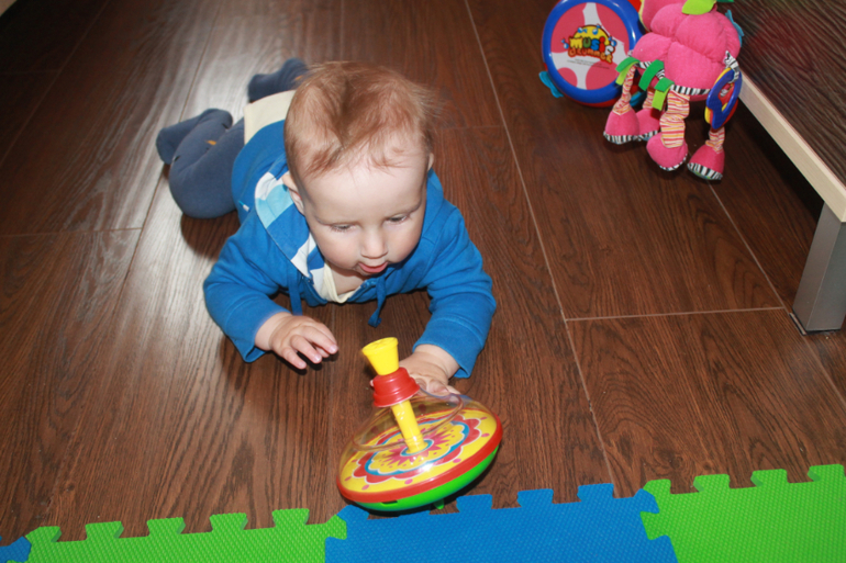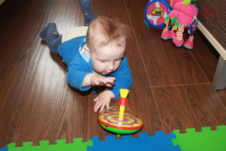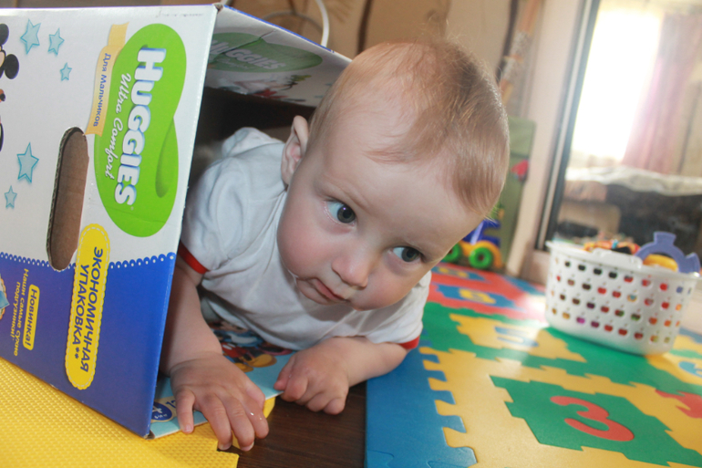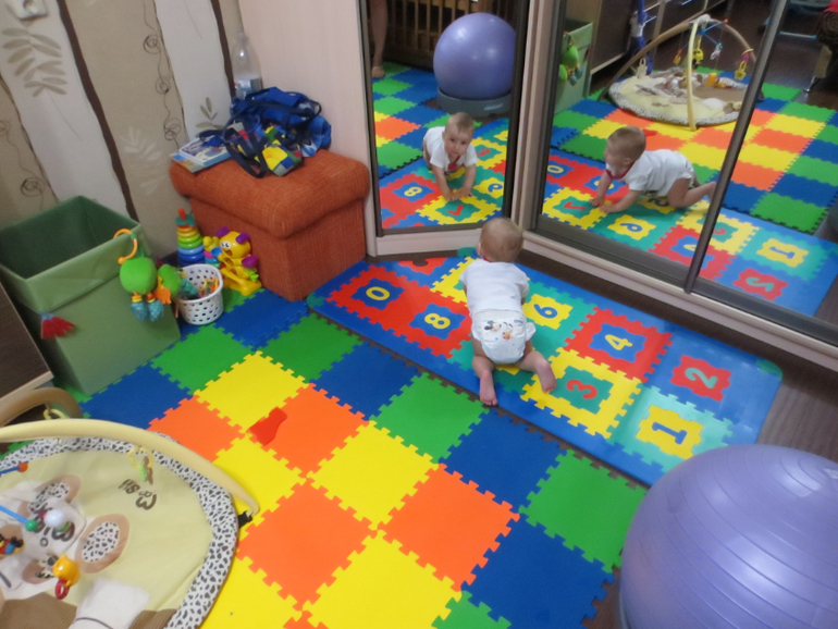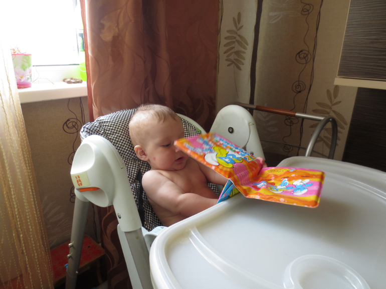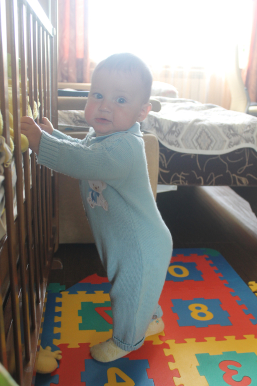 кушаем за троих.Мы отлично сидим и хорошо ползаем, довольно уверенно встаем у опоры на ножки, переворачивается с живота на спину и обратно. А еще мы делаем попытки переставлять ножки, держась за диван. Может самостоятельно встать на коленки и прыгаем на них :) Еще у нас вылезло 2 зуба, ждем следующие.