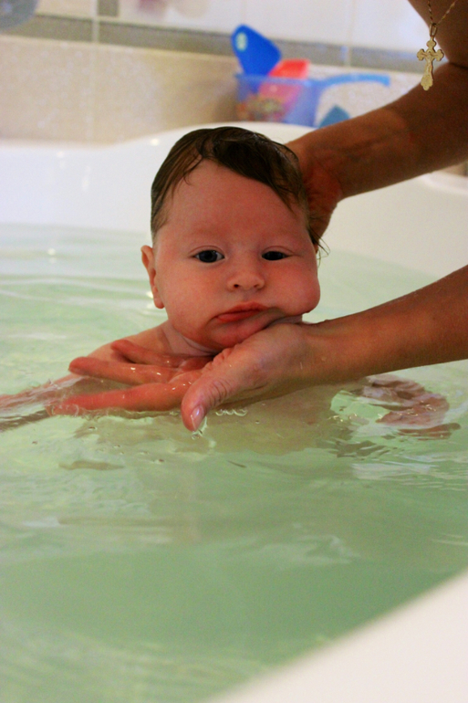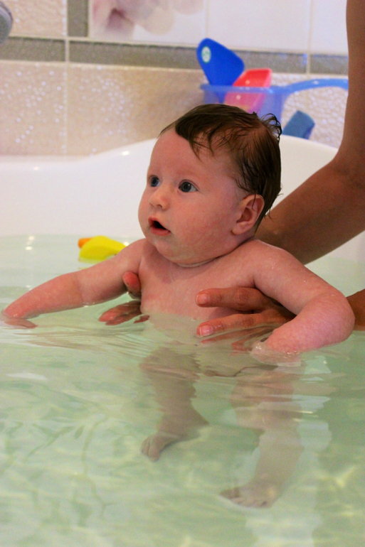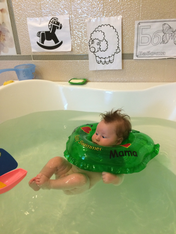 Очень любим купаться в круге, с 2,5 месяцев активно барахтается в воде крутиться на 360 градусов, подпрыгивает так что вода заливается в круг и приходится её постоянно убирать )) купаем температура воды 34 градуса.