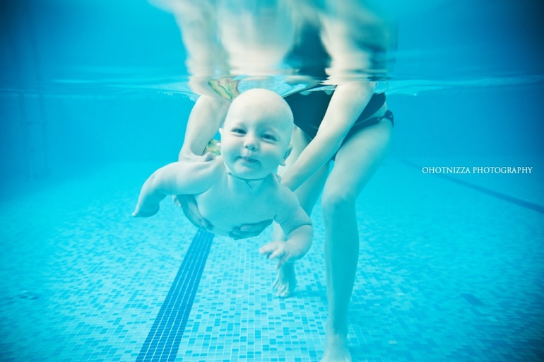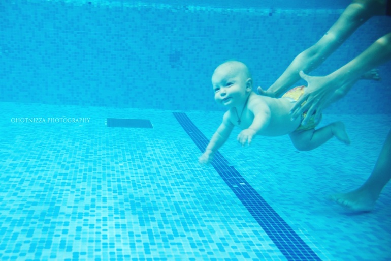 Бассейн (большой лягушатник с достаточно теплой водой) Саше пришелся по вкусу. Тренер не заставлял если малышу что-то не нравилось, ныряли чаще всего на ручках у мамы или с участием мамы. Плавно проводил Сашу под водой после слова «ныряем». Малыш через некоторое время стал команду узнавать и после «ныряем» зажмуривал глаза и захлопывал рот. Саша ни разу за 5 месяцев не заплакал, а в последние 3 месяца при виде бассейна расплывался в улыбке и хохотал. За 5 месяцев: