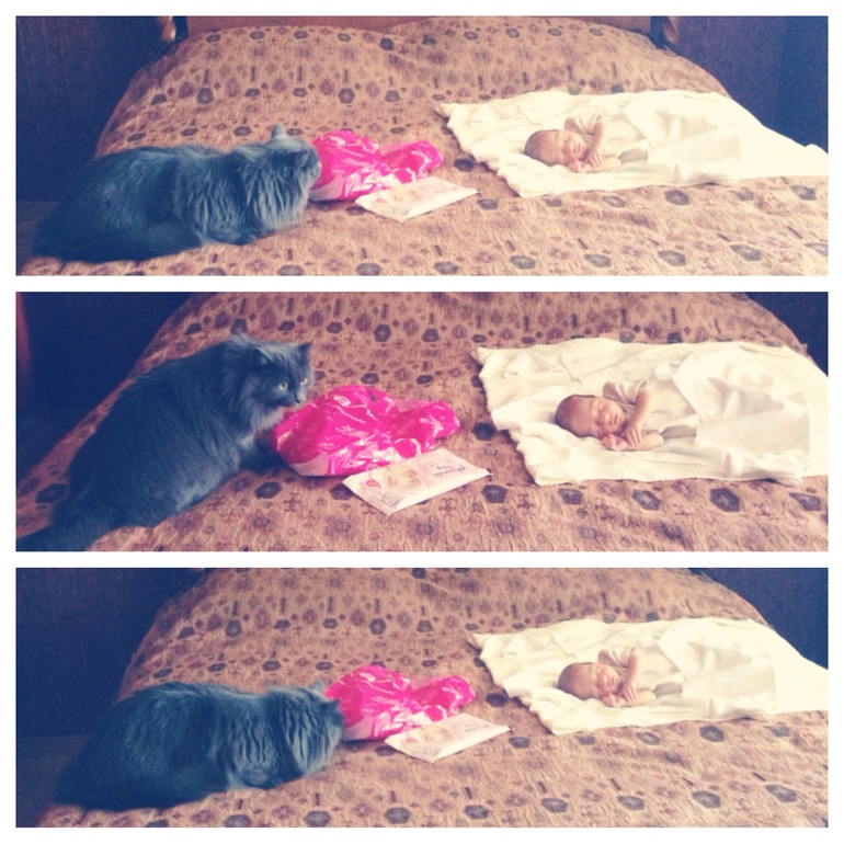 В гостях у моих родителей) кошка решила познакомиться с новым членом семьи, но подойти ближе побоялась :)