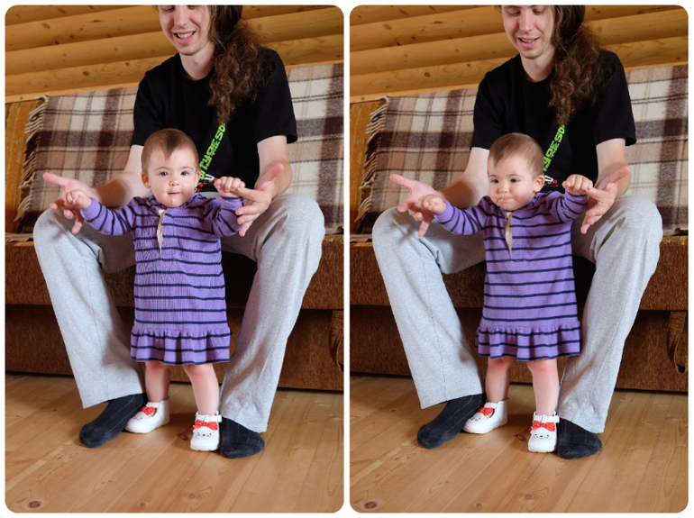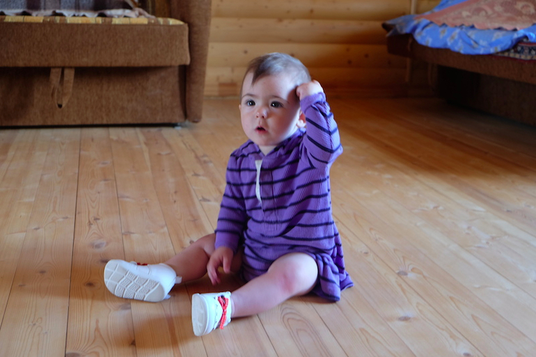 Физ. развитие: уверенно садится и сидит с 6,5 месяцев (не с колен, а из положения лёжа чаще всего, хотя может и с колен, и как угодно). Ползает на четвереньках уверенно с 7-ми, до этого пыталась на четвереньках, но потом больше понравилось по-пластунски, толкаясь одной ногой (это она в меня, я толкалась одной ногой и ползала по кругу, пока не пошла :Р). Но потом-таки расчухала, что так быстрее. В 7,5, когда были в нашей глухой деревне, начала регулярно вставать на ножки с опорой. Берёт мелкие предметы двумя пальцами: ягоды, крошки. Что там ещё бывает? Ладушки не умеет, иногда машет руками, но ладони не раскрывает и не хлопает. Или это уже эмоциональное развитие? В деревне вроде как начала показывать, где нос - показала несколько одним пальчиком на мне, бабушке, папе. А потом перестала. То ли не хочет, то ли забыла, то ли просто совпало, что она тыкала нас в носы вообще)) Занимаюсь я с ней через пень-колоду, честно говоря. Пытаюсь сейчас это исправлять. Так вот эмоциональное, эмоционально речевое развитие: на всех орёт. Да, орёт))) Визжит с удовольствием и разными интонациями. Вчера напугала семимесячную девочку в магазине (Марусю при этом приняли за мальчика, т.к. она была в голубом рыбацком комбезе, огромные банты на тапках не помогли)), позавчера довела до слёз своим восторженным визгом девятимесячную, с которой сначала мирно общалась. Побила четырёхлетнего мальчика в деревне от избытка чувств) Он тоже чуть не плакал, и чуть не дал сдачи, по-моему) Визжит при виде всех детей, кошек, собак. Моя кошка, которая живёт с мамой, обходит её по широкой дуге, когда были в деревне все вместе - почти не заходила в избу из-за этого. Куры тоже вызвали дикий восторг) Кроме визгов, говорит: дядя, тятя, мама (особенно чётко, когда зовёт), папа, баба, ко-ко, га-га и любимое слово - ка-ка :Р Или на разных нотах: ка-ка-ка-ка, или одно отрывистое ка! - которое заменяет ей "вот", "ого" и т.п.) Ну и к лепету слогов добавилась какая-то совсем неразборчивая болтовня, но с очень интересными интонациями. Стала пугаться незнакомых, а иногда незнакомых, при этом тоненько ухает, потом начинает вопить мамам и тянет ручки ко мне. Поэтому мне нравится, когда она немножко пугается:))) Из игрушек любит книжки, любит их открывать-закрывать, слушать (недолго), и пирамидку (купила обычную от Фишер Прайс в дополнение к Оболл без штырька). А вообще, как и все её ровесники, предпочитает ложки, миски, пакеты, крошки, тряпки, бутылки, пластиковый слюнявчик. В принципе, можно выдать ей любой предмет обихода, и на какое-то время это её займёт.