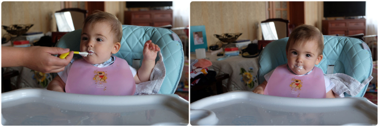 Прикорм: ест овощи, фрукты, каши, ввели творог. Свои овощи не ест, только банки. Любимое из еды - баночная тыква и свежий персик. Даю и в ниблере, и целиком, если не боюсь, что измажет всё) Она очень умильно держит большой персик двумя руками и вгрызается в него своими двумя зубами, а потом рассасывает волокна. Персиком не давится. Пробовали многие ягоды: смородину, малину, чернику, морошку. Малину кладу на столик, берёт её двумя пальцами и ест сама.