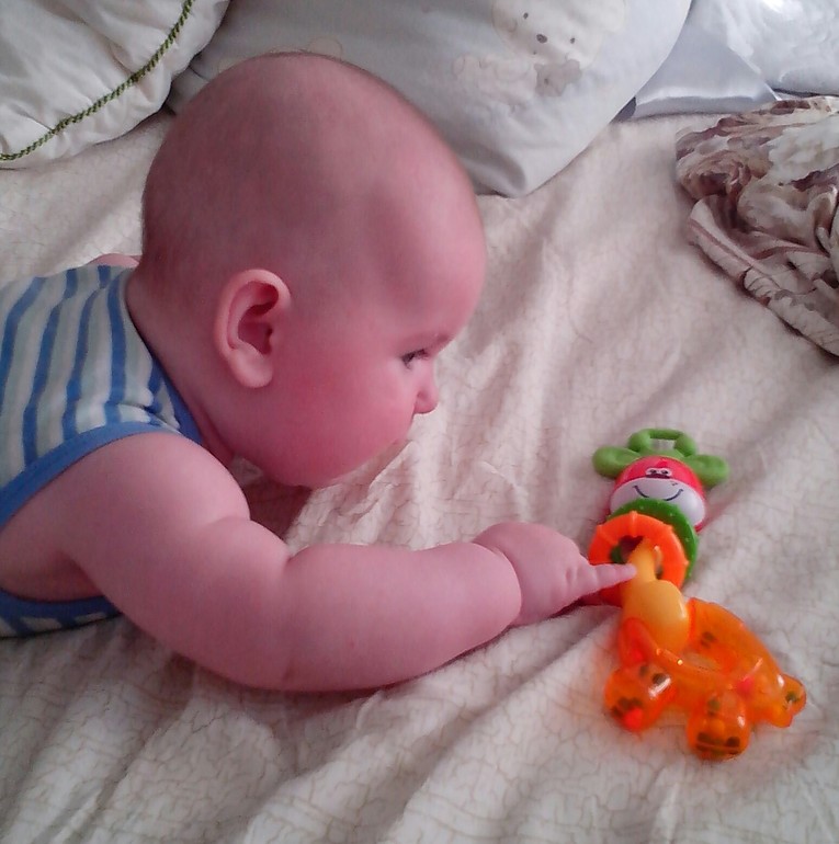 Физическое развитиеУже пару дней как Фёдор начал их ощуповать и тянуться к игрушкам. Сегодня документально подтверждаем )) Нам 4 мес 15 дней