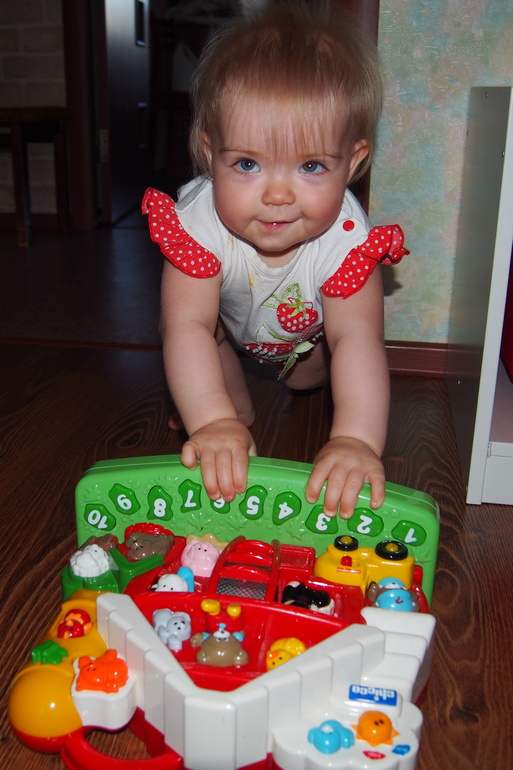 Ах да, любит еще собирать игрушки. Но не с целью прибрать, конечно, а просто раньше умела только вынимать игрушки, а теперь и обратно положить. И пока ей это интересно, мы собираем вместе. Потом, наверно, будет также, как Тимошка, канючить, чтобы мама за нее все убрала))
