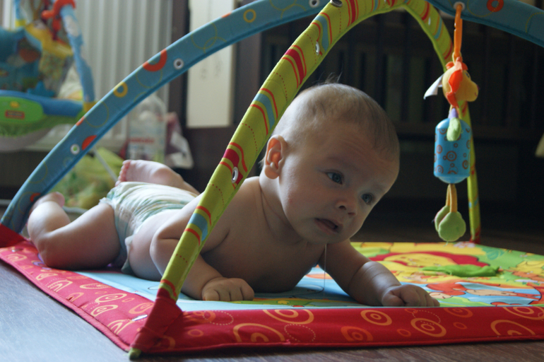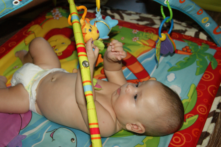 У нас на кровати любит играться - просто лежит, рассматривает все, любит руки свои рассматривать и в рот тянуть, облизывать ))