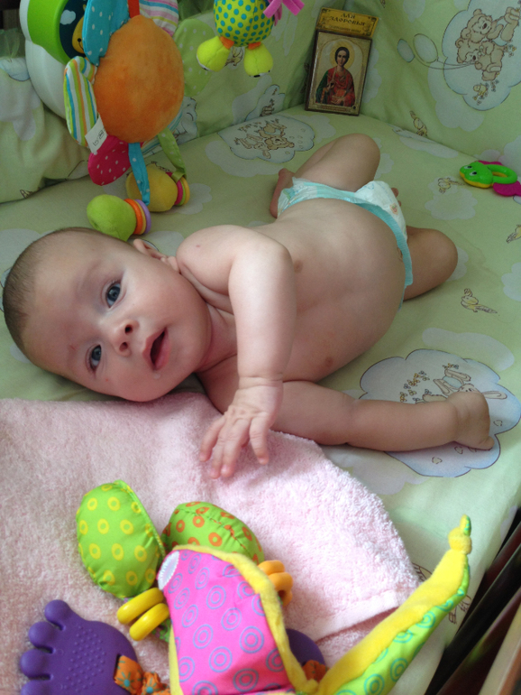 Играется погремушками и игрушками которые я прицепила по бокам кроватки, разговаривает, издает всякие звуки прикольные.