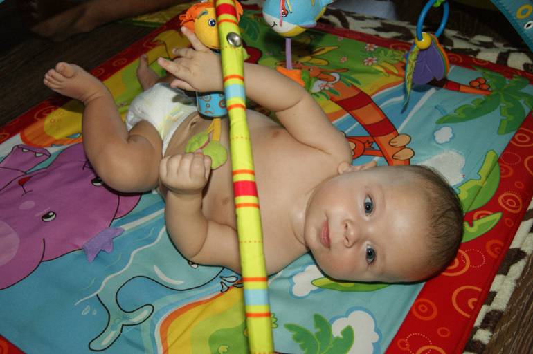 Игры у нас в разных местах - любит лежать в кроватке, смотреть на мобиль (очень любит), пытается ухватить игрушки которые вертятся, но они высоко ))