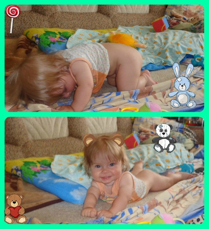 Артёмка уже активно и достаточно быстро ползает,самостоятельно встаёт у опоры ,при этом даже держа в одной ручке игрушку. Стоя, может переступать с ножки на ножку. Также переставляет ножки, когда я, держа его подмышки, стимулирует к тому, чтобы он пошел.
