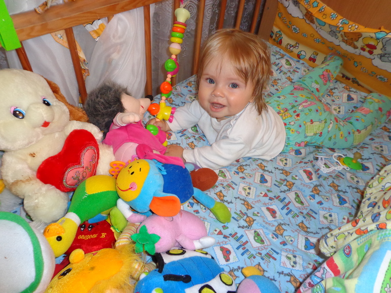 Смешливый малышок наш активно ползает, поворачивается из стороны в сторону и обладает цепкой хваткой,всё что надо и не надо,но ему всегда всё нужно и потрогать и попробовать на вкус)встаём у опоры,сидим: свободно берет в ручки игрушки и перекладывает их с места на место. Достаточно длительное время он может провести, открывая и закрывая крышку на коробке, складывая и раскладывая стаканчики один в другой, возиться со своими музыкальными игрушками.