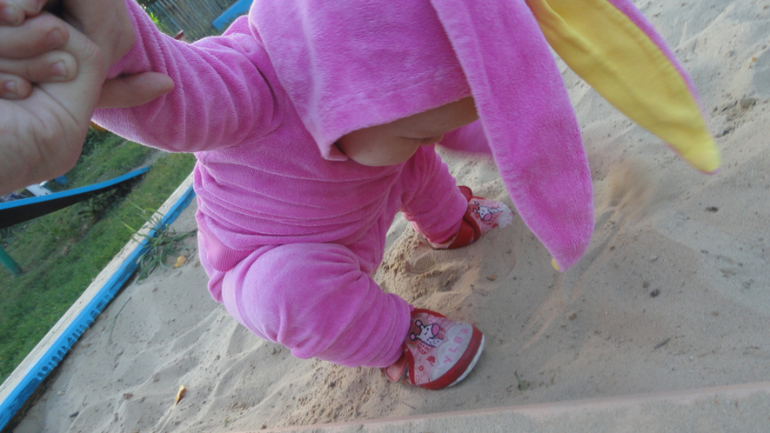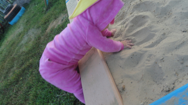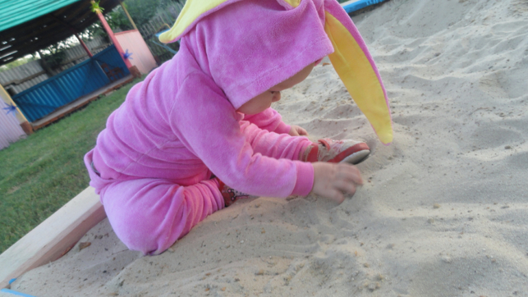 -а еще мы подружились с песочком,думала в рот сразу потянет,а нет-пока никаких позывов сожрать песок не возникало-сделала вывод что пора прикупить совочек)))