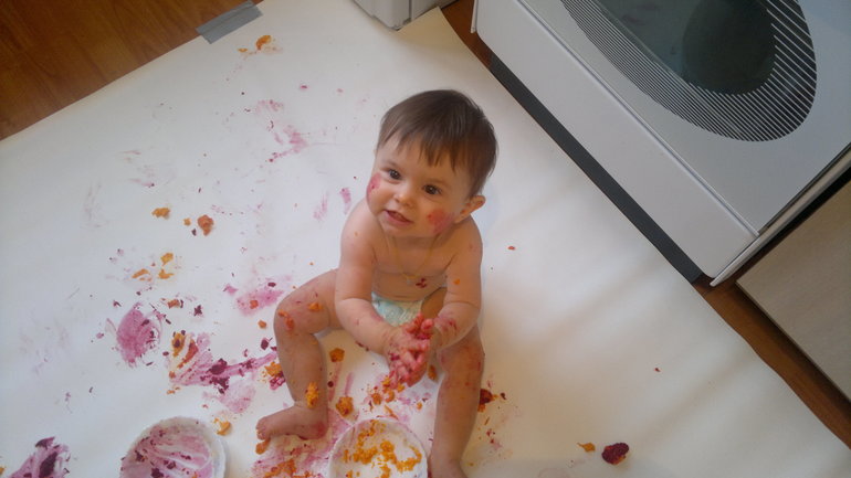 Наклеели на кухне на полу 2 больших листа от обоев с помощью строительного скотча, на Художницу одели только памперс и вперед к творческим процессам!