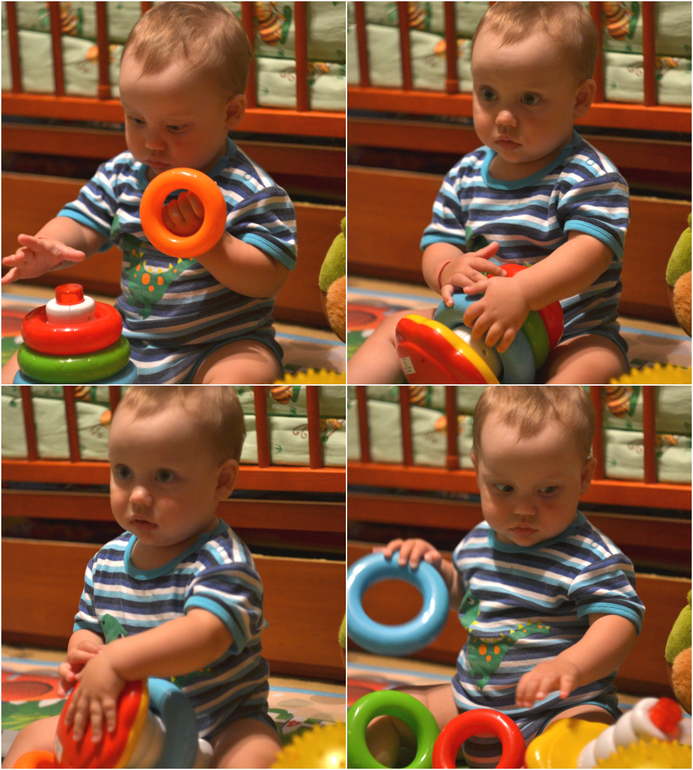 Показываю как складывать пирамидку, пока без интереса. Разбирает сам, да так хитро, что я умираю )))) Верхних 2 кольца руками снимает, а нижние типа уже лень, берет в руки стержень и переворачивает, кольца сами и слетают, вот такой хитрюга растет, сам додумался, что так проще ))))
