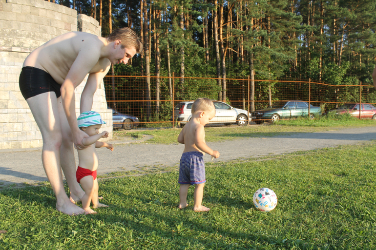 Взаимодействие ребенка с окружающимиВ эти выходные съездили на речку, погода у нас не просто шепчет, а жарит.....ну прямо пекло. Вот и решили мы с друзьями выбраться. С нами был мальчик Ромка 1,4 года. Не зря говорят, что маленькие учатся у взрослых: отвели мы их в воду, Ромка начал плехать по воде ногами, Арсенька мой посмотрел и тоже давай так делать. Прикольно так...... Потом они и с мячиком вместе играли и кушали. Было весело))) А еще мы пытались постоянно с Ромки шапку стянуть))) Фоточки наши: