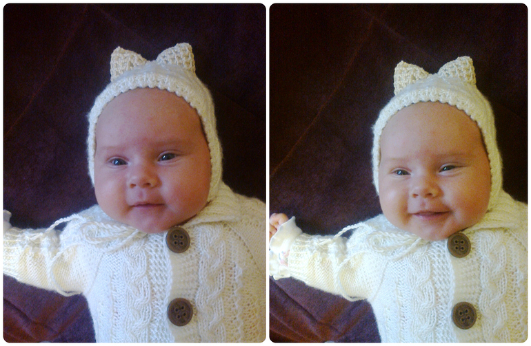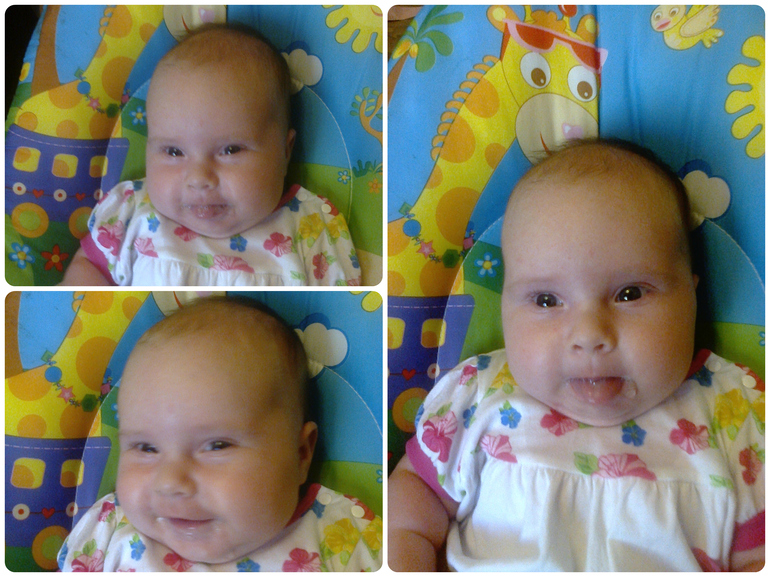 Настюшка очень много болтает, улыбается, научилась смеяться, но пока только несколько раз мы слышали смех. Любит людей гораздо больше, чем игрушки, не разделяет на своих и чужих. Умеет долго лежать и гулить сама с собой, дает мне заниматься домашними делами. Может долго меня гипнотизировать, когда я смотрю ТВ или сижу в компьютере и расплывается в улыбке, когда я наконец-то на нее посмотрю.