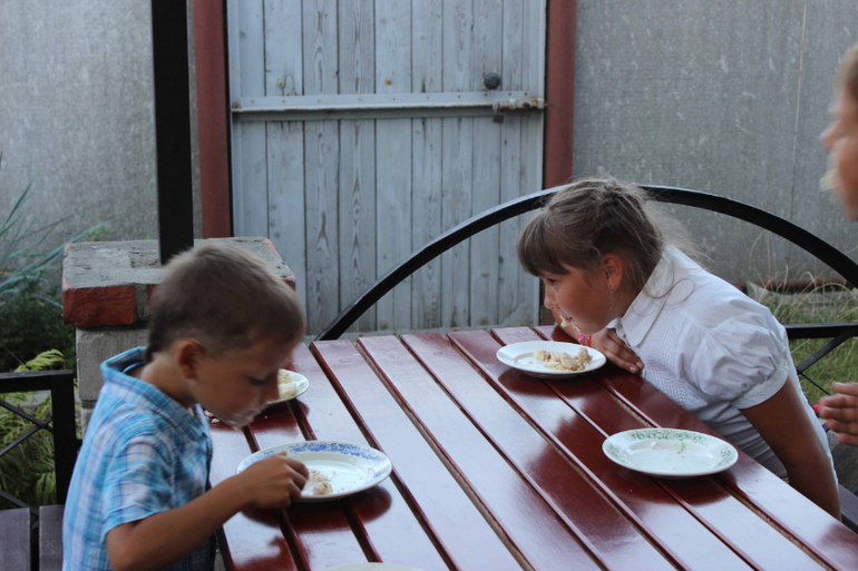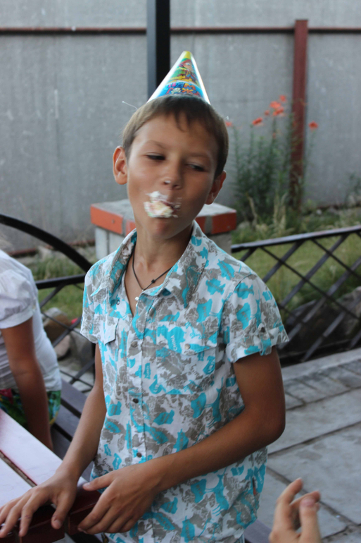 С тортом мы решили поиграть и кто быстрее ел его с тарелки без рук. Это наш победитель. Все получали призы.