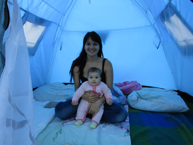 Эля проявила себя молодцом - не хныкала, не капризничала, спать ложилась вовремя и спала как месячный младенец. Первая ночь в палатке тоже прошла хорошо. Единственное что было неудобно, Эля очень не любит спать под одеялом и постоянно раскрывается. А так как ночью в палатке без одеяла было, мягко скажем, не очень комфортно, мне приходилось очень часто просыпаться и ее накрывать. Выспаться мне не удалось совершенно)